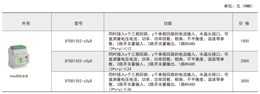 DTSD1352 - xSyD系列導(dǎo)軌式多回路電力儀表主要用于多個(gè)三相回路的全電參量測(cè)量,最多可同時(shí)接入x個(gè)三相回路、y個(gè)單相回路的電流輸入。可直接或間接測(cè)量電壓電流、功率、功率因數(shù)、相角、不平衡度、諧波等參數(shù)。