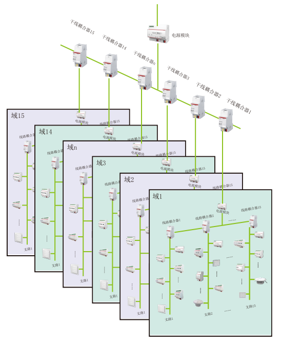 系統(tǒng)一般采用分層結(jié)構(gòu),搭建項目時,劃分成域和支線這種分布式總線結(jié)構(gòu),一方面其布局清晰,布線簡單,容量大,對各種類型的項目尤其是大型公建項目特別適用。另一方面有效提高了系統(tǒng)的可靠性。由于每個域和每條支路分別分配了KNX電源,這種電氣的隔離使得系統(tǒng)的某個部分出現(xiàn)故障時,其他部分仍能繼續(xù)工作。一條線路或一個域內(nèi)的數(shù)據(jù)通信不會影響到其它范圍的數(shù)據(jù)通信。