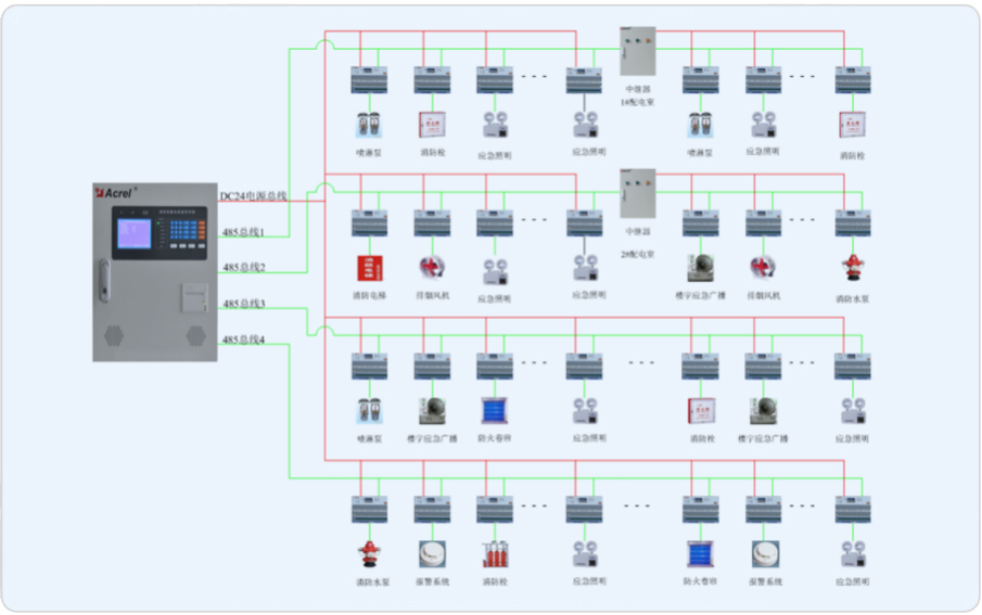 系統(tǒng)組網(wǎng)共分為站控管理層、網(wǎng)絡(luò)通訊層、現(xiàn)場(chǎng)設(shè)備層三層,該項(xiàng)目通訊總線共接入9條通訊總線,總線在樓層配電箱手拉手串接后,接入消防設(shè)備電源中繼器,在接入壁掛式后臺(tái),組成消防設(shè)備電源監(jiān)控系統(tǒng)的大動(dòng)脈。AFPM100消防設(shè)備電源監(jiān)控系統(tǒng)能夠?qū)ο涝O(shè)備的電源進(jìn)行實(shí)時(shí)的監(jiān)控,通過(guò)檢測(cè)消防設(shè)備電源的電壓、電流、開(kāi)關(guān)狀態(tài)等相關(guān)信息,從而判斷消防設(shè)備電源是否有斷路、短路、過(guò)壓、欠壓、缺相、錯(cuò)相以及過(guò)流(過(guò)載)等故障信息并報(bào)警、記錄。通過(guò)友好的人機(jī)交互界面,實(shí)時(shí)反映出被監(jiān)控設(shè)備電源的狀況,并集中顯示,從而有效避免在火災(zāi)發(fā)生時(shí)消防設(shè)備由于電源故障而無(wú)法正常工作的危急情況,保障消防聯(lián)動(dòng)系統(tǒng)的可靠性。該項(xiàng)目現(xiàn)場(chǎng)共有152只AFPM3-2AV消防設(shè)備電源探測(cè)器模塊。