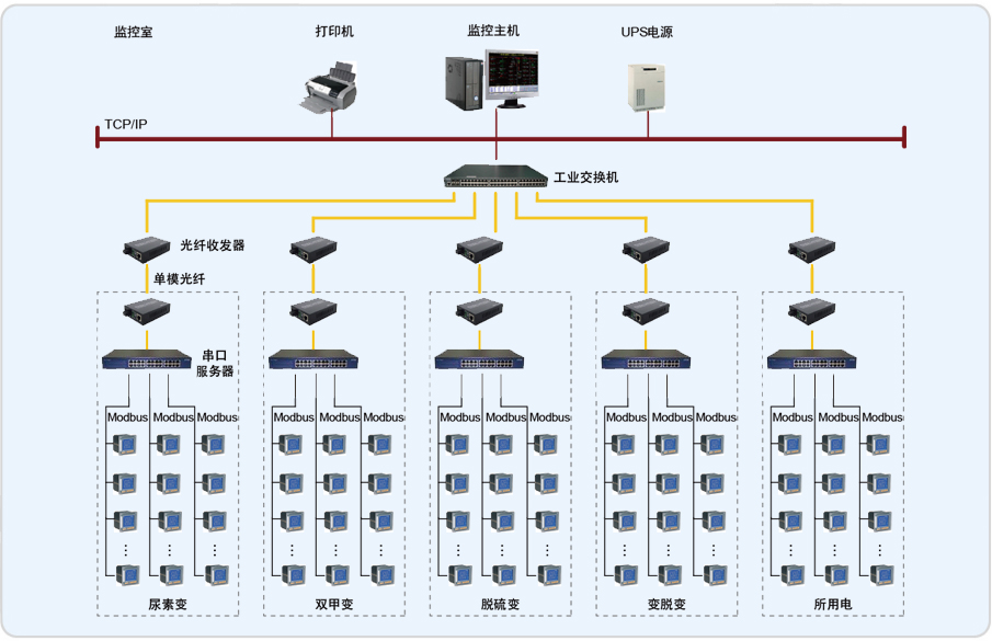 中化平原電力監(jiān)控系統(tǒng)現(xiàn)場分為5個低壓配電室,配電室內(nèi)采用安科瑞PZ系列電力監(jiān)控儀表采集各回路的電流、電壓、電能等電參量,然后通過中間層采集設備經(jīng)光纖傳到監(jiān)控室計算機上,實現(xiàn)遙測、遙信功能。