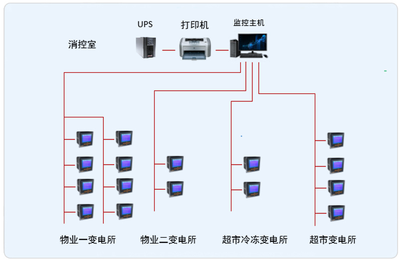 系統(tǒng)采用Acrel-2000型電力監(jiān)控系統(tǒng),整個(gè)系統(tǒng)采用網(wǎng)絡(luò)分布式結(jié)構(gòu),監(jiān)控主機(jī)位于消防監(jiān)控室中,其他4個(gè)配電室分別位于地下一層。該項(xiàng)目實(shí)現(xiàn)了湖州萬(wàn)達(dá)4個(gè)10kV變電所的智能管理。所有監(jiān)控設(shè)備均通過(guò)屏蔽雙絞線(xiàn)至后臺(tái)監(jiān)控主機(jī),從而實(shí)現(xiàn)遠(yuǎn)程監(jiān)控。