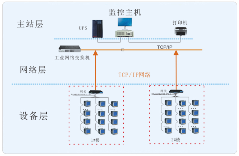 系統(tǒng)采用Acrel-5000能耗管理系統(tǒng),該系統(tǒng)主要采用分層分布式計算機網(wǎng)絡結(jié)構(gòu),如系統(tǒng)結(jié)構(gòu):站控管理層、網(wǎng)絡通訊層和現(xiàn)場設備層。其中上海環(huán)境監(jiān)測中心項目現(xiàn)場設備分布為1#樓及2#樓,該所有監(jiān)測點都在樓層強電井的配電箱內(nèi),所有儀表通過485屏蔽雙絞線鋪設至值班室,經(jīng)采集器至系統(tǒng)主機從而完成儀表數(shù)據(jù)的采集并管理。