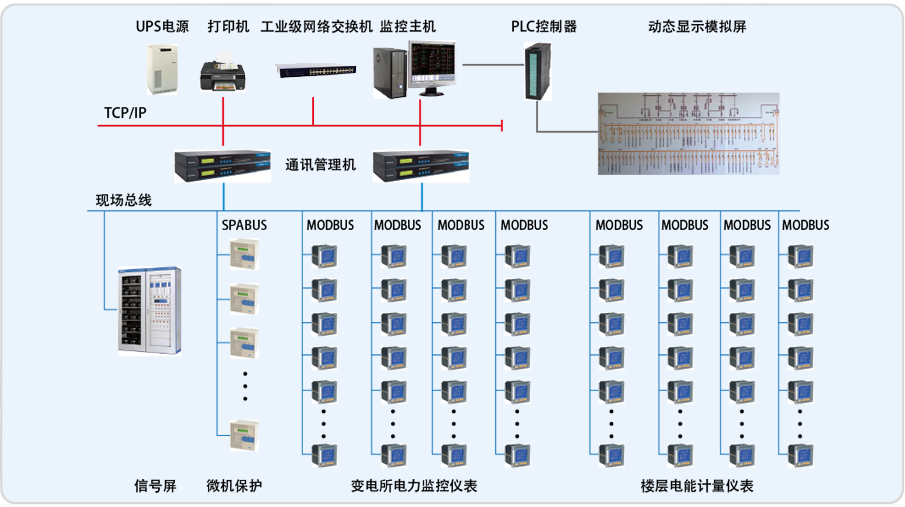 整個系統(tǒng)采用網(wǎng)絡(luò)分布式結(jié)構(gòu),監(jiān)控主機(jī)位于地下一層變電所值班室內(nèi),各變電所配電柜內(nèi)安裝有本公司ACR330ELH、ACR220EFLK儀表共計200多回 路,第三方設(shè)備共計200多臺。系統(tǒng)采用開放的通訊協(xié)議,通過現(xiàn)場總線與高低壓配電系統(tǒng)、變壓器溫控裝置、直流屏、模擬屏實現(xiàn)數(shù)據(jù)通訊功能。同時監(jiān)視系統(tǒng)提供標(biāo)準(zhǔn)的RS485接口向上連接到BMS系統(tǒng)。