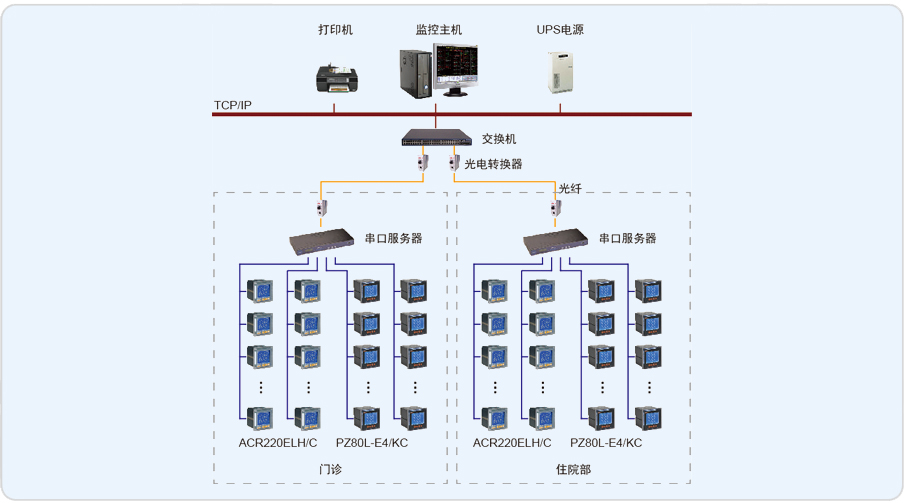 整個(gè)系統(tǒng)采用網(wǎng)絡(luò)分布式結(jié)構(gòu),監(jiān)控主機(jī)位于報(bào)告廳和外科樓的地下一層的動力中心中。該項(xiàng)目實(shí)現(xiàn)了哈醫(yī)大一院2個(gè)樓內(nèi)遠(yuǎn)程精細(xì)化及時(shí)性報(bào)警。設(shè)計(jì)方案為2個(gè)樓內(nèi)的2個(gè)配電室,儀表數(shù)據(jù)通過485接口,MODBUS通訊協(xié)議經(jīng)數(shù)據(jù)采集器輸送到值班室主機(jī)。