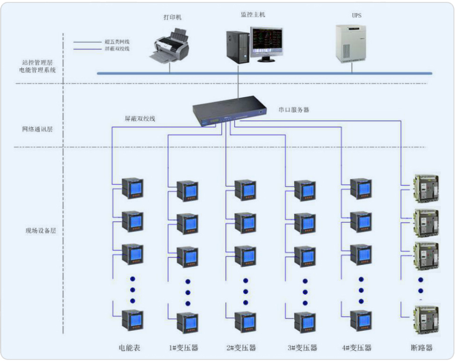 系統(tǒng)應(yīng)通過多功能的電力監(jiān)控裝置、通訊網(wǎng)絡(luò)和計算機(jī)軟件,實(shí)現(xiàn)醫(yī)院內(nèi)供配電系統(tǒng)在運(yùn)行過程中的數(shù)據(jù)采集、運(yùn)行監(jiān)視、事故預(yù)警、事故記錄和分析、電能質(zhì)量檢測、三相不平衡監(jiān)視、繼電保護(hù)等,完成醫(yī)院的安全供電、用電管理、設(shè)備管理和運(yùn)行管理。系統(tǒng)由主控層、通訊管理層和現(xiàn)場控制層構(gòu)成。系統(tǒng)要求盡量減少集中采集數(shù)據(jù)的裝置以保證系統(tǒng)的通訊可靠性。