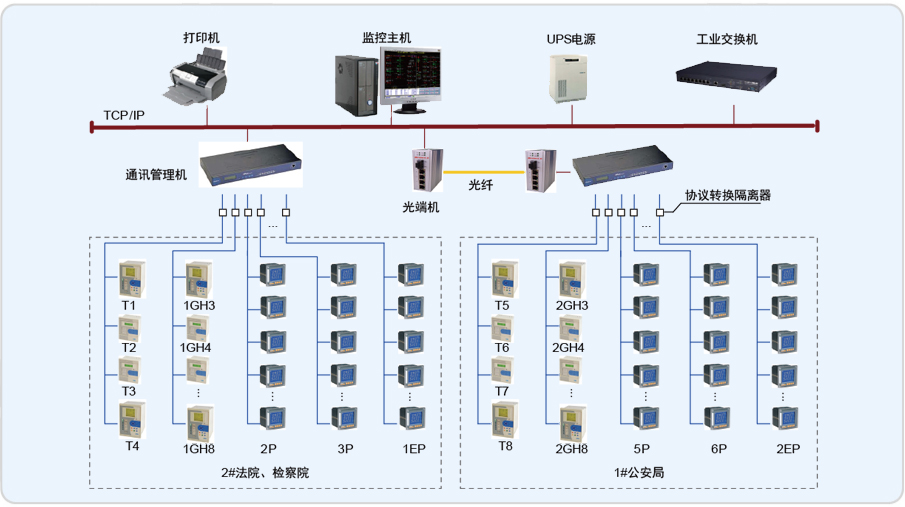 該項目有1#(公安局)、2#(法院、檢察院)兩個變配電室,室內(nèi)的配電柜中安裝了安科瑞332塊PZ系列可編程智能電測表。為了能夠?qū)崿F(xiàn)電力參數(shù)實時遙測、電能計量、電能報表等功能,系統(tǒng)采用Acrel-3000電能管理軟件,做到集中管理、集中控制,省去了值班人員現(xiàn)場抄表的煩瑣,具有投資少、簡明實用、便于智能管理等優(yōu)點。