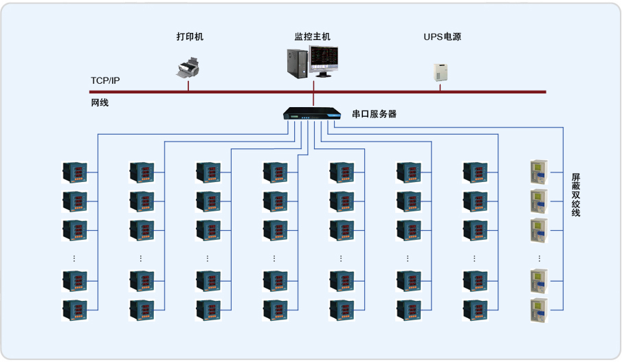 Acrel–2000軟件通過中間采集設(shè)備采集現(xiàn)場電力監(jiān)控儀表數(shù)據(jù),并在系統(tǒng)一次圖顯示出來。主要實現(xiàn)功能如:遠(yuǎn)程抄表查,詢各個配電室各個回路按照時間段進(jìn)行歷史數(shù)據(jù)查詢。趨勢曲線,功率實時趨勢顯示及歷史趨勢查詢功能。系統(tǒng)遙信狀態(tài)報警,根據(jù)本系統(tǒng)的設(shè)計意圖,如果重要回路或者照明回路三相中某一相電流負(fù)荷超過額定值的90%,系統(tǒng)必須立刻發(fā)出聲光報警并彈出指示框指明報警源,提醒管理人員注意負(fù)載的三相平衡和負(fù)載率,同時自動記錄事件發(fā)生的時間和回路名稱,以便用戶查詢,追憶故障原因。