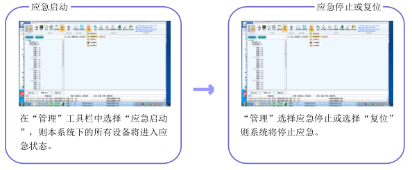 正常情況下本系統(tǒng)與消防火災(zāi)報(bào)警主機(jī)通過開關(guān)量輸入或RS232通訊方式保持相連,有火災(zāi)報(bào)警情況時,本系統(tǒng)將自動啟動應(yīng)急狀態(tài)(標(biāo)志燈常亮、照明燈亮起)。若手動模擬啟動應(yīng)急與復(fù)位參考如下操作步驟: