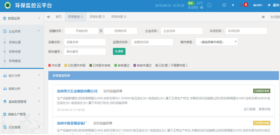 通過(guò)關(guān)聯(lián)分析、超限分析、啟停時(shí)間分析,及時(shí)發(fā)現(xiàn)環(huán)保治理設(shè)備未開(kāi)啟、異常關(guān)閉及減速、空轉(zhuǎn)、降頻等異常情況,同時(shí)通過(guò)數(shù)據(jù)分析還可以實(shí)時(shí)監(jiān)控限產(chǎn)和停產(chǎn)整治企業(yè)運(yùn)行狀態(tài),如圖所示: