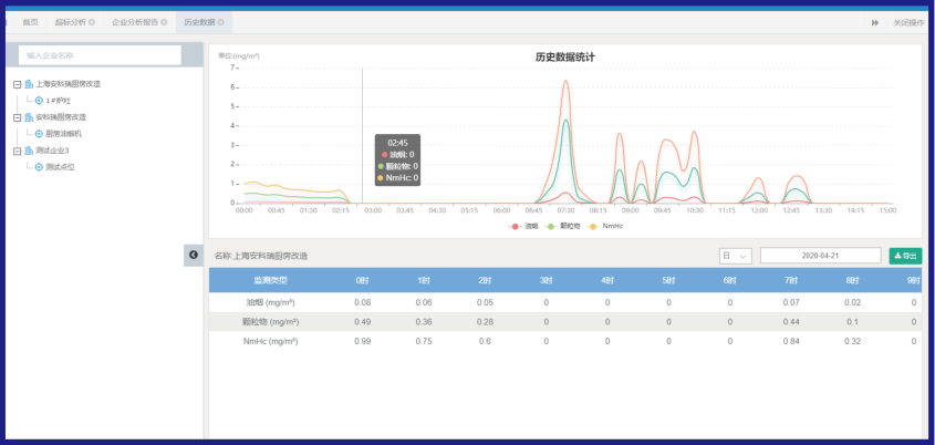 對油煙排污數(shù)據(jù)的監(jiān)測,包括油煙排放濃度,顆粒物,NmHc等數(shù)值采集監(jiān)測;同時(shí)對監(jiān)控風(fēng)機(jī)和凈化器的啟停狀態(tài)、運(yùn)行數(shù)據(jù)進(jìn)行監(jiān)測。